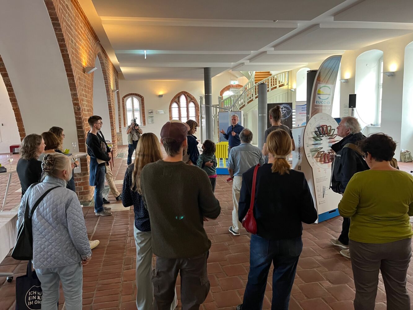 Schon am Tag zuvor, am 22. September 2025, wurde die im H2Mare-Projekt TransferWind von EUCC-D konzipierte Wanderausstellung „Meer · Grüne · Zukunft“ im Rostocker Rathaus eröffnet. H2Mare Projektkoordinator Matthias Müller (Siemens Energy) und Dr. Ralf Tschullik (Amt für Umwelt- und Klimaschutz Rostock) gaben dabei Einblicke in die notwendigen Schritte bei der Forschung zu grünem, offshore-produziertem Wasserstoff bzw. in die Bedeutung von Küsten an Nord- und Ostsee für die zukünftige Herstellung und den Transport von grünem Wasserstoff. Nardine Stybel (EUCC-D) führte die Gäste im Anschluss durch die Ausstellung und stellte die fünf Ausstellungsmodule vor. Die Ausstellung war bis Ende September in Rostock zu Gast und tritt im Anschluss ihre Rundreise durch Norddeutschland an.